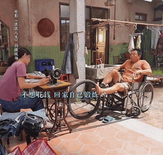 妻子(殷桃饰)把缝纫机改成了自行车,一边缝衣服,一边帮他锻炼肌肉。