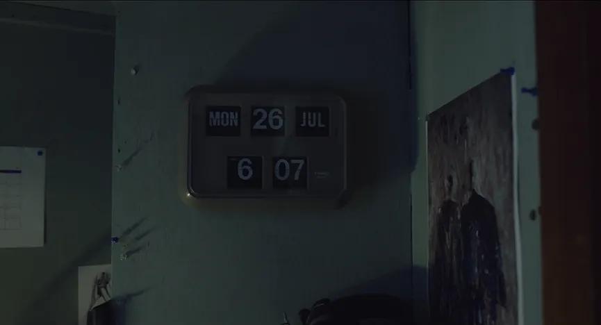 照生的房间是每一次回溯时光的起点,更精确点说是他挂在墙上的日历,当日期跳转到7月26日时,伴随摄影机的横摇,镜头由日历到床,整个房间和照生一起苏醒。固定时间只是效果,为什么需要重复这么一套程式化的流程才得以使其成立?我们耳熟能详的《百年孤独》的开头可以很好回答这个问题,“多年以后面对行刑队…将会想起看冰块的下午” ,“行刑队”与这组不断扫过房间的镜头一样,跨越了过去与未来,作为勾起回忆的提示器而存在。
