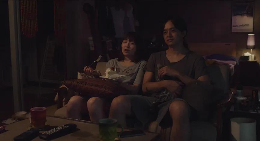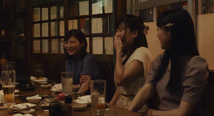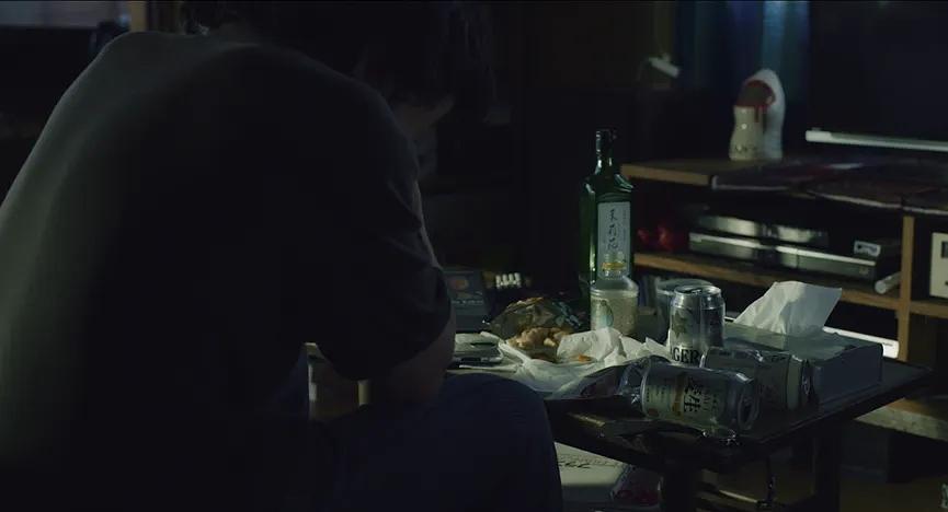 “饮酒”被编码为一种主题的过程也是靠回忆慢慢展开而推进的,除了频率上的明显变动,我们还要注意到更多人数的“饮酒”行为:女主人公叶第一次饮酒是在一家居酒屋里的聚会,照生则是在庆祝生日,而这两幕在影片里又具备平行剪辑的同时性,这类饮酒也就作为一种仪式性动作被突出。我们还能看到的另一个共同点则是,仪式性的饮酒动作带来叙事上的新变化:叶与照生平行剪辑的这场戏,第一次向观众揭示二人曾经是情侣现已分手,且都是通过引入新的人物来实现;无独有偶,照生与叶的初遇也是在庆祝照生演出及生日的酒会上,且同样是通过第三者的“牵线”……酒的来源与种类也能划分为便利店的便携啤酒和居酒屋/小酒吧的精致酒精,但这类编码更多是体现人物特征而非作用于整部影片的主题和叙事,故按下不表。
