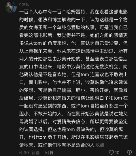 看完这部电影我相信很多人都跟我一样 感觉男主跟自己很像 summer也和自己之前相处过的女生很像 但是看了两个解读电影的之后发现怎么对这部电影的想法能差异这么大。但确实这部电影主要是站在男性的视角来探讨两性关系的 终究是自己来发现问题。 观点1: 也就是跟我看完这部电影时候的想法一样,男性不能将自己的情感寄托于在别人身上。 summer是一个普通的女孩 她遵从自己的内心 想做什么就做什么 她喜欢自己的长发但是又能毫不留情地将其剪去 女性是绝情的 因为在很多事情上面她们都能享受自己魅力带来的便利 比如去雪糕店打工带来了很多的客人 租房子比市场上更低价 坐公交有几十次几百次的被回头看 例子真的是很多很多 代入我身边很多女性朋友的视角 也确确实实是如此 有的经常在dy被私信有的出来吃饭也被搭讪 数不胜数。而男生很多也跟男主一样 因为女生随意的一两句话而脑补出很多乱七八糟的东西 说好听是脑补 不好听则是意淫 一旦出现一个这样的女生就会不断陷入一段段脑补出来的画面 会对这个女孩越来越在乎 想各种各样的方式引起女生的注意 是的 这就是我们哥布林的做法。 女生主动起来便可以和我们快速地发展起来 我们也会不由自主地陷入其中 不管对方是否说出不想认真的话 自己也会欺骗自己 那就不认真吧。summer带他走进了自己的世界 在床上吐露了从来没跟人谈论过的心声 自己也会在想我真的这么重要么。 女人总是做自己喜欢做的 虽然她与我足够亲密 但男女主始终不是恋人 没办法 在喝酒的时候被骚扰自己也没有名份去保护 只有尊严被人践踏的时候才敢还击 而女生也没有站在自己的角度思考自己是否做错了 还生气了。当时看到这里真的忍无可忍 男人没有脸面尊严是真的不可以。 后面summer真的只是把男主当成普通朋友 无视男主 和其他女生戴上钻戒 最后也能毫无悔意地做出与自己之前说过相违和的话 与一个男人结婚。所以人是会变的 什么都会变 不要看定一个人就想与一个人一辈子 不可能的 什么都会变 正像summer不愿意给男主一个口头承诺一样 结婚的誓言也没有用。
